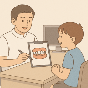 「口がいつも開いている」「寝ているときにいびきをかく」「前歯が出てきた」など、日常で気づいたことを遠慮なく教えてください。歯並びが悪くなる原因はお子さんの日常生活に現れています。